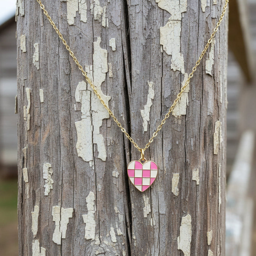 Gold Chain Checkered Heart Necklace | Pink or Black Charm | Trendy Statement Jewelry