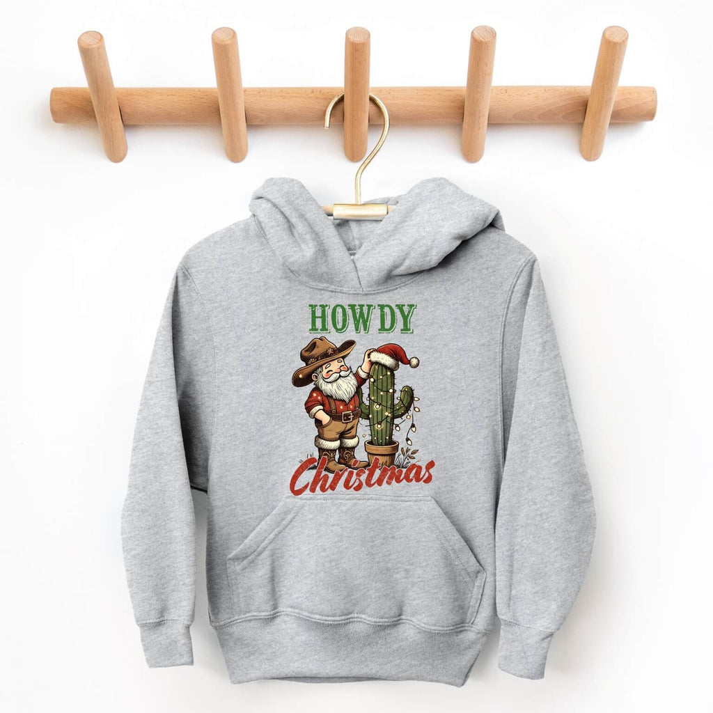 Kids “Howdy Santa” Christmas Hoodie | Cowboy Santa Sweatshirt in Red or Sport Gray
